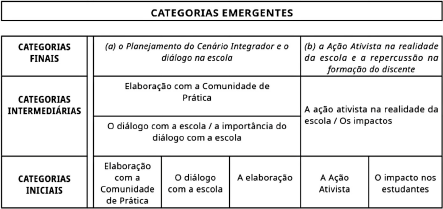 Serão apresentadas, a seguir, as categorias emergentes do processo de análise, que são: (a) Planejamento do Cenário Integrador e o diálogo com a escola e (b) Ação Ativista na realidade da escola e a repercussão na formação do discente.