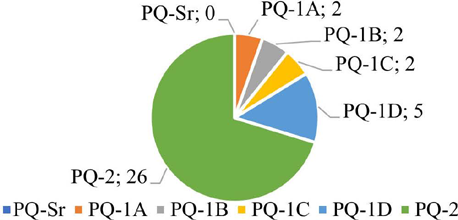 A distribuição entre as categorias/níveis apresenta 26 bolsistas na categoria 2, o que representa um percentual expressivo de 70%. Já os níveis da categoria PQ-1 acumulam os demais, totalizando 11 bolsistas, que representam 30%. O levantamento não apontou bolsista PQ-Sr.