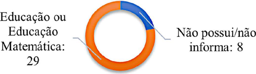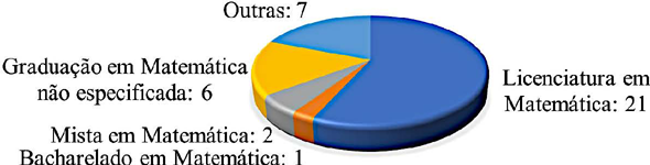 A graduação dos bolsistas PQ apresentou uma variação de 5 possibilidades, com liderança para a licenciatura em Matemática, com 21 bolsistas (57%). Em seguida, 7 bolsistas (19%) apresentaram graduação em outras áreas de conhecimento distintas da Matemática: licenciatura e bacharel em Pedagogia; Psicologia; Ciência da Computação; Matemática Computacional; Engenharia; licenciatura em Ciências com habilitação em Matemática; licenciatura em Ciências Exatas com habilitação em Matemática. A graduação em Matemática (licenciatura ou bacharelado) de 6 bolsistas (16%) não foi especificada no Currículo Lattes nem identificada em outras fontes de dados, podendo significar ausência de trabalho de conclusão de curso, formação realizada anterior à implementação da licenciatura, entre outros fatores. Todavia, identificamos 2 bolsistas (5%) com graduação mista em Matemática (licenciatura e bacharelado) e apenas um bolsista (3%) bacharel em Matemática.