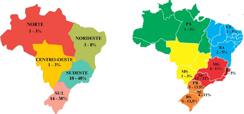 Os pesquisadores estão distribuídos nas 5 regiões do país e em 10 estados da federação. Como observado anteriormente, as regiões Sudeste e Sul lideram as frequências, de modo que juntas concentram 32 bolsistas, cerca de 86%. A distribuição de bolsistas nos estados dessas regiões registra São Paulo na liderança, com 12 bolsistas (32%); seguida dos estados do Paraná e Rio Grande do Sul, ambos com 5 bolsistas (13,5%); Minas Gerais e Santa Catarina, os dois com 4 bolsistas (11%) e, a seguir, Rio de Janeiro com 2 bolsistas (5%). As regiões Nordeste, Norte e Centro-Oeste agregam os demais pesquisadores bolsistas PQ em EDM (5; 14%), distribuídos nos estados da Bahia (2; 5%), Ceará (1; 3%), Pará (1; 3%) e Mato Grosso do Sul (1; 3%).