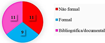 O gráfico 1 proporciona uma compreensão da distribuição dos diferentes tipos de espaços de ensino dentro do contexto dos trabalhos, destacando a variedade de ambientes educacionais considerados ou investigados. No que tange aos elencados em pesquisa bibliográfica e/ou documental, podemos citar como exemplo a investigação conduzida por Rodrigues, Langhi e Camargo (2018), apresentada em formato de CP. Os autores apresentam uma avaliação dos desafios e possibilidades relacionados ao ensino de assuntos astronômicos a estudantes com deficiência visual.