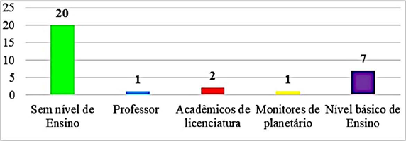 Um dos trabalhos teve como público-alvo os professores de Ciências do 6.º ano do Ensino Fundamental, como exemplificado no estudo de Zanatti e Siqueira (2012). Dois trabalhos foram voltados para acadêmicos de Licenciatura. Um foi destinado a monitores de planetário. Sete trabalhos tiveram como foco o Ensino Básico, sendo que três deles eram direcionados ao Ensino Médio. Dos quatro restantes: um mencionou o Fundamental 2, outro visou aos estudantes da Associação de Pais e Amigos dos Excepcionais (Apae), um foi específico para crianças com idades entre 5 e 10 anos, e um não apresentou explicação quanto ao nível do Ensino Básico ao qual se destinava. Os dados referentes ao público-alvo se encontram ilustrados pelo gráfico 2.