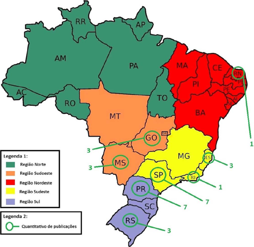 A figura 1 exibe a origem da pesquisa conforme a Categoria 4, demonstrando os Estados brasileiros nos quais os trabalhos foram realizados e as regiões que apresentaram o maior número de publicações.