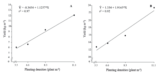 The increase in the number of bunches had a positive effect on yield per plant (Table 3). Cultivated plants with two bunches were more productive than plants with only one bunch at all planting densities, but the yield per plant was not influenced by planting density for the same number of bunches.