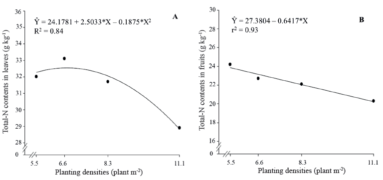 The total-N content in tomato leaves varied significantly for different planting densities. The total-N content in the leaf increased with increasing planting densities from 5.5 plants m-2 to 6.6 plants m-2, with a subsequent drop (Figure 2A). The total-N leaf content ranged from 27.4 g kg-1 to 33.2 g kg-1, remaining close to the range of concentrations considered adequate: from 28.0 g kg-1 to 60.0 g kg-1 (Jones Junior 1999, Camargos et al. 2000, Fernandes et al. 2002).