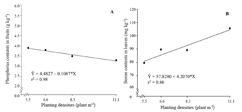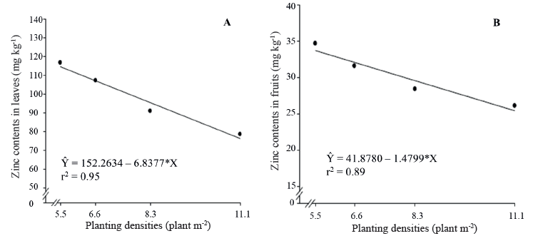 A significant difference was observed for Zn content in leaves and fruits, between treatments of planting density, whose behaviour was linear, increasing with the decrease of planting density (Figures 4A and 4B, respectively). Such behaviour is probably due to the increase in demand, when more plants were grown in the same experimental plot. However, leaf concentrations were relatively high, ranging from 72.6 mg kg-1 to 121.2 mg kg-1, although they agreed with the adequate range reported in the literature, i.e., between 20.0 mg kg-1 and 100.0 mg kg-1 (Jones Junior 1999, Fernandes et al. 2007). It is possible that there is a contamination with Zn by the fertilizers used to compose the nutrient solution.