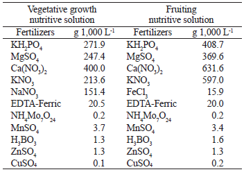 After transplanting, the temperature and relative air humidity inside the greenhouse were measured daily, using two thermometers and two hygrometers, placed at two different points at a height of 1.10 m from the floor surface. The plants were grown in a vegetative growth solution at full ionic strength. With the appearance of bunches, the nutrient solution was changed, and a fruiting solution, adapted from Fernandes et al. (2002), was applied (Table 1). The solution used in the vegetative growth phase contained: N = 8 mmol L-1; P = 2 mmol L-1; K = 4 mmol L-1; Ca = 2 mmol L-1; Mg = 1 mmol L-1; S = 1 mmol L-1; Fe = 35 mmol L-1; Mn = 19 mmol L-1; B = 21 mmol L-1; Zn = 4 mmol L-1; Cu = 0.9 mmol L-1; and Mo = 0.7 mmol L-1. The solution used in the fruiting phase contained: N = 12 mmol L-1; P = 3 mmol L-1; K = 8.6 mmol L-1; Ca = 3 mmol L-1; Mg = 1.5 mmol L-1; S = 1.5 mmol L-1; Fe = 59 mmol L-1; Mn = 20 mmol L-1; B = 25 mmol L-1; Zn = 4 mmol L-1; Cu = 1.3 mmol L-1; and Mo = 0.7 mmol L-1.