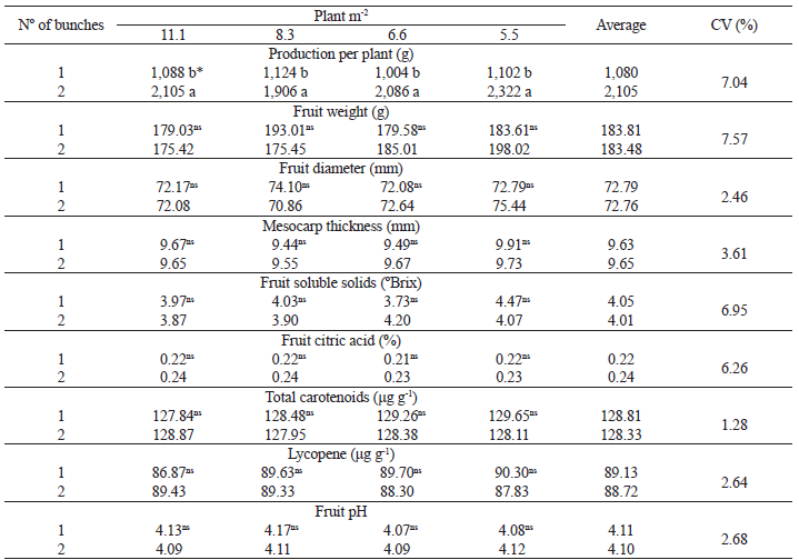 Fruit quality (soluble solids, citric acid, carotenoids, lycopene and pH) was not influenced by density or number of bunches per plant (Table 3). The total soluble solids (ºBrix) content is an important quality attribute during the ripening stage for many fresh fruits, including tomato (Siddiqui et al. 2015), and, for the in natura market, high-quality tomato fruits must have percentages of ºBrix above three (Schwarz et al. 2013). In this study, it was observed that the values for total soluble solids were higher than the value suggested above.