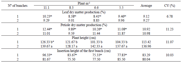 There was no significant effect of planting densities and number of bunches on the proportion of dry matter allocated in leaflets and petioles and insertion height of the first bunch. There was difference only for plant height, when comparing plants with one and two bunches (Table 4).