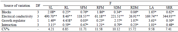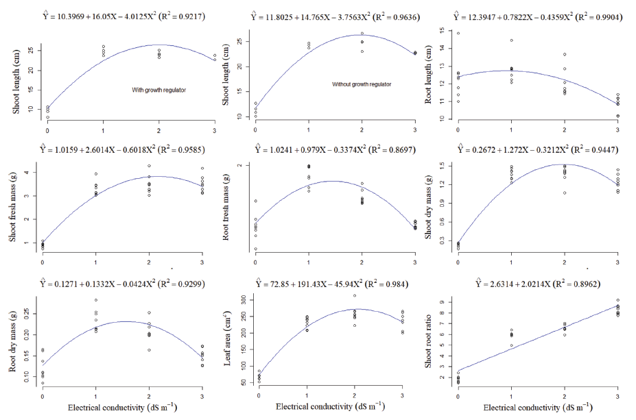 The estimated maximum electrical conductivity values for the variables shoot fresh mass (2.2), root fresh mass (1.5), shoot dry mass (2.0), root dry mass (1.6) and leaf area (2.1) were obtained in the 1.4-2.2 dS m-1 range. The maximum root length was estimated at 0.9 dS m-1. At this electrical conductivity range, which promotes the highest plant growth, the shoot to root ratio values were estimated between 5.5 and 7.0 (Figure 2). With respect to the growth regulator, a significant difference was only observed for root length, whereby the treated seedlings showed less root growth (Tables 2 and 3).