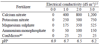 1 Measured using a handheld conductivity meter (CD-203, Phtek); 2 values based on Furlani (1999);3 ConMicros Standard® - micronutrient mixture (Allplant®); 4measured with a portable pH meter (PH-100, Phtek).