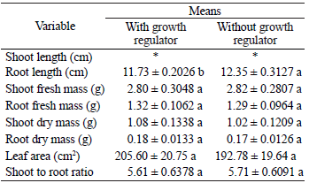 There was no significant interaction between the electrical conductivity and growth regulator factors for most of the variables, except for shoot length (Table 2). As such, the factors were studied separately, and interaction decomposition was performed only for the variable shoot length (Figure 2; Table 4).