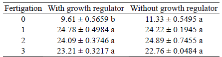 * The fertigation and growth regulator interaction was significant. Means followed by the same letter in the row do not differ according to the F test.