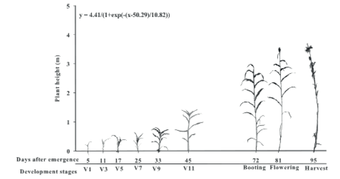 Samples were collected at 5, 11, 17, 25, 33, 45, 72, 81 and 95 DAE and corresponded to the phenological stages V1, V3, V5, V7, V9, V11 and harvest, respectively (Figure 1). In terms of height, it was observed that the plant presented a relatively slow growth up to V11, from which the growth rate increased.