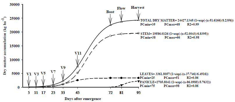The accumulation of total dry matter was slow in the initial stages, precisely up to 35 DAE (near the V9 stage). From this moment, the accumulation of dry matter increased significantly up to 68 DAE (Figure 2), close to the booting stage, when the rates returned to stabilize at a lower level. In this 39-day interval, the crop went from 2,307 kg ha-1 to 22,531 kg ha-1 of dry matter, representing an accumulation of 20,224 kg ha-1 (Figure 2). This interval coincides with the transition from the vegetative to the reproductive phase, and the increase of dry matter, in this period, is due to the increase of the leaf area and photoassimilated reserves in the stems, which will be translocated during the reproductive phase, just like results found for wheat (Streckll & Rosalll 2009).