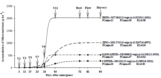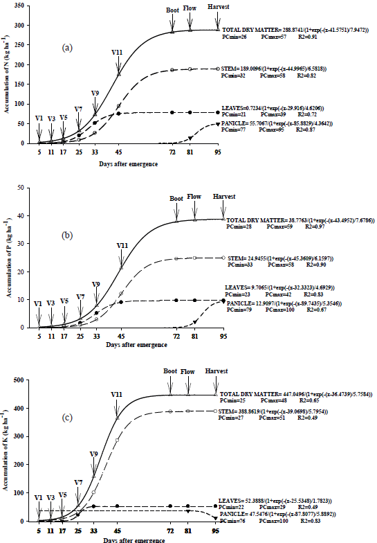 The inflection point corresponds to the moment in which the maximum rates of dry matter and nutrients accumulation occurred in the biomass sorghum plants. The minimum (PCmin) and maximum (PCmax) points of curvature were calculated according to the method described by Venegas et al. (1998), using the parameters of the nonlinear equations PCmin = X. - 2b and PCmax = X. + 2b, where PCmin indicates the moment when there were significant gains in the accumulation of dry matter and nutrients and PCmax the moment when the accumulation of the elements begins to stabilize.