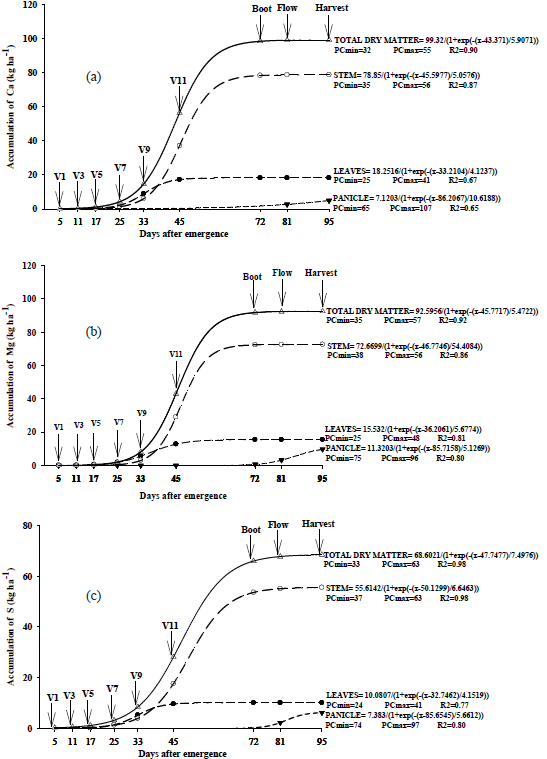 The total accumulation of S was slow up to the V9 stage (Figure 4c), so that the highest accumulation rates were between 33 and 63 DAE. In this 30-day interval, the crop went from 8.4 kg ha-1 to 60.7 kg ha-1 of S, representing an accumulation of 52.3 kg ha-1 (Figure 4b). This period also coincides with the period of greatest accumulation of dry matter by the crop (Figure 2). Knowing that S is an essential macronutrient for being incorporated into amino acids or sulfur-containing metabolites, it plays a crucial role for plant growth and adaptation to stress (Forzani et al. 2018), what might explain the higher demand by S in the period of higher dry matter accumulation. Sulfur and Ca are considered to be immobile nutrients in the plant, with a very low rate of redistribution after reaching some organs of the plants; the leaves, for instance (Taiz et al. 2017). For both elements, the leaves presented the maximum point of curvature at 41 DAE (Figures 4a and 4c).