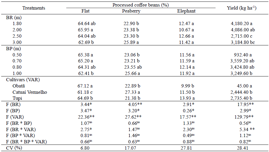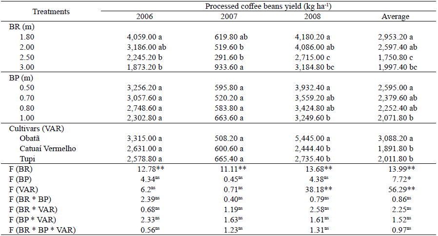 Data for average processed coffee yields, at the first three harvests, and F test values for factors and their interactions are shown in Table 2. Yield was significantly affected by the evaluated production factors (spacings between rows, between plants and between cultivars); however, there was no significant interaction between these factors.