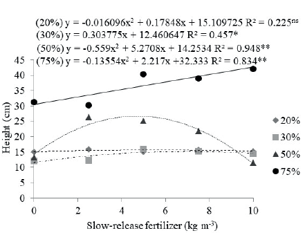 50 %-shaded environment, which yielded seedlings with a mean height of 21.68 cm, with a fertilizer dose of 4.71 kg m-3 (Figure 1). According to Freitas et al. (2011), height is an important biometric variable used to indicate if the seedlings are suitable for permanent planting in the field. Based on their evaluations of a slow-release fertilizer, several authors have demonstrated that its use leads to an increase in the height of fruit seedlings, for instance E. precatoria (Mendonça et al. 2006), yellow passion fruit (Mendonça et al. 2007), tamarind (Mendonça et al. 2008), papaya (Serrano et al. 2010), pineapple (Freitas et al. 2011) and Suriname cherry (Eli et al. 2013).