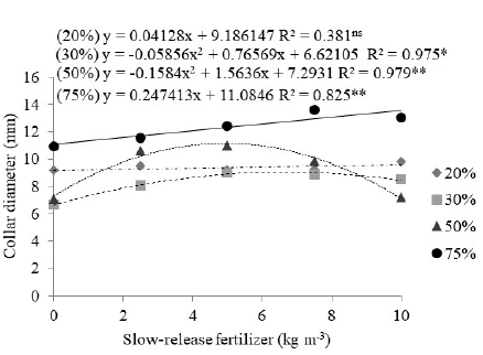 As for the root collar diameter, an increasing linear behavior was observed for the slow-release fertilizer doses applied to the 75 %-shaded environment, where the maximum value (13.56 mm) was reached with the dose of 10 kg m-3 (Figure 2). For the 50 %-shaded environment, the fertilizer kept an increment up to the dose of 4.94 kg m-3, obtaining a root collar diameter of 11.15 mm. According to Valladares et al. (2011), shade-tolerant plants show larger collar diameters, if compared to intolerant plants.