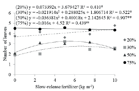 As for the number of leaves, an increasing linear behavior of the doses applied to the 20 %-shaded environment was observed, where the highest value (4.41) was reached with the dose of 10 kg m-3 of slow-release fertilizer (Figure 3). In the 50 %-shaded environment, the adjustment followed the quadratic regression model, where the maximum number of leaves (3.24) was reached with the dose of 5.50 kg m-3 of fertilizer. Although there was no significant difference between the different fertilizer