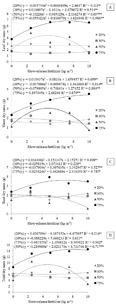 The maximum values reached for leaf, shoot, root and total dry mass were 6.83 g, 4.65 g, 3.61 g and 14.55 g, with slow-release fertilizer doses of 7.37 kg m-3, 10.0 kg m-3, 7.13 kg m-3 and 8.0 kg m-3 (Figures 4A, 4B, 4C and 4D), respectively, in the 75 %-shaded environment.