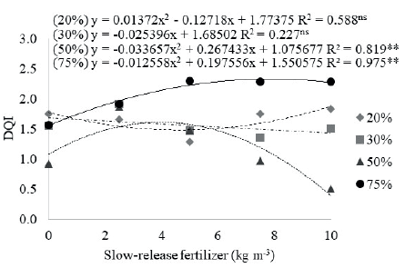 The Dickson quality index (DQI) was adjusted to the quadratic model as per the increases in the slow-release fertilizer doses, yielding a better quality for E. precatoria seedlings in the 75%-shaded environment, where the maximum index of 2.33 was reached with an estimated dose of 7.87 kg m-3 (Figure 5), characterized as better seedlings, due to their higher DQI value (Gomes et al. 2002). There was no effect of the fertilizer doses on the DQI in the 20 %- and 30 %-shaded environments.