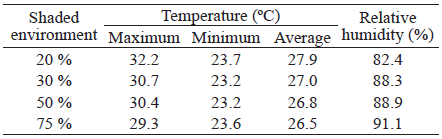 The experiment was conducted in a seedling nursery at the Embrapa Acre, in Rio Branco, Acre state, Brazil (10º1’30”S, 67º42’18”W and 160 m of altitude), from January 2016 to January 2017. The climate of the region is Awi, hot and humid, according to the Köppen classification, with an annual average temperature of 24.5 ºC, relative humidity of 84 % and annual rainfall of 1,700-2,400 mm. During the evaluation period, data about the environments under analysis were collected using a Datalogger AK 174 (Table 1).