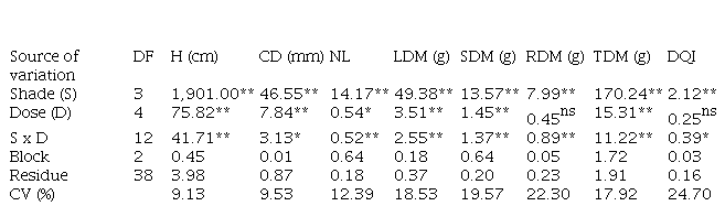 The analyses of variance showed that all the E. precatoria growth variables were influenced by the different shaded environments and by the interaction between such environments and the slow-release fertilizer doses. Concerning the slow-release fertilizer doses, only the root dry mass and the DQI were not significant (Table 2).