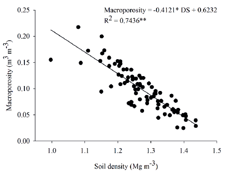 The application of 480 m. ha-1 year-1 of liquid swine manure, when compared to the control, led to a soil density reduction from 1.28 Mg m-3 to 1.20 Mg m-3 in the 0.00-0.05 m layer. Reinert et al. (2008) and Kaiser et al. (2009) consider, for a clayey soil, the value of 1.4 Mg m-3 as the critical reference value for soil density, on which the roots of the cultivated plants can face restrictions to grow and develop. In the present study, this density reference value was not reached in any of the soil layers analyzed. However, the relationship between soil density and macroporosity (Figure 1) suggests that, for the studied soil, density values above 1.27 Mg m-3 reduce the volume of macropores to values below 0.10 m3 m-3, what hinders the diffusion of gases in the soil, thus affecting the root system development of the cultivated plants (Tormena et al. 1998, Xu et al. 1992).