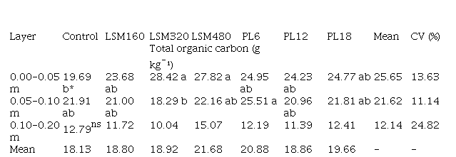 The treatments with application of poultry litter did not show any increase in the organic carbon content of the soil in the surface layer. Comin et al. (2013) compared the effects of fertilization with liquid swine manure and swine deep-litter on the soil and found that the deep-litter system provided a greater carbon accumulation in the soil than the liquid swine manure did, what, according to these authors, was due to the high carbon/nitrogen ratio of the deep-litter, providing a lower decomposition rate and a greater carbon accumulation.