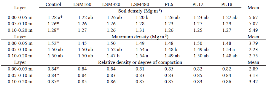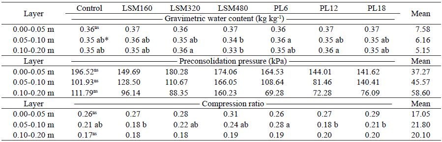 Regarding the compression ratio at the 0.00-0.05 m layer, no significant statistical differences among the treatments were observed (Table 4). The variations observed for the soil compression ratio were caused by changes in the soil density and pore
