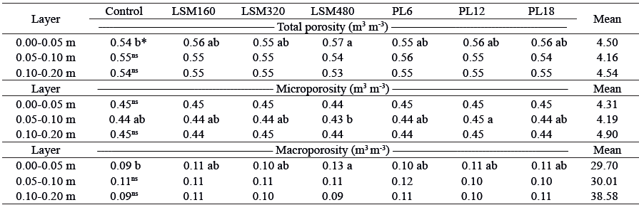 The soil pore system was slightly affected by the liquid swine manure and poultry litter applications, ranging from 0.54 m. m-3 in the control to 0.57 m. m-3 in the treatment with a higher dose of liquid swine manure (Table 3).