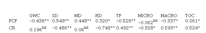 * Significant at 5 %; ** significant at 1 %; ns not significant; GWC = gravimetric water content; SD = soil density; MD = maximum density; RD = relative density; TP = total porosity; MICRO = microporosity; MACRO = macroporosity; TOC = total organic carbon; PCP = preconsolidation pressure; CR = compression ratio.