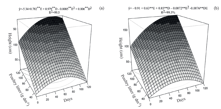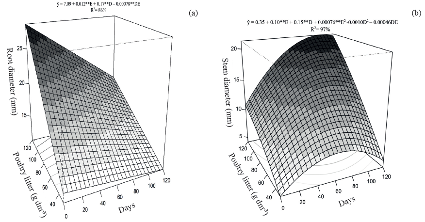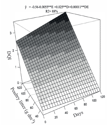 3. There is a linear increase in the Dickson quality index, as a function of days after emergence and poultry litter doses, reaching a maximum value of 3.0;