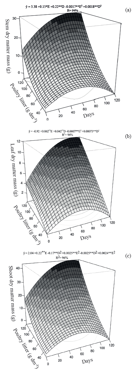 2. The shoot dry matter mass increases as the dose increases, while the root system decreases with increasing poultry litter doses;