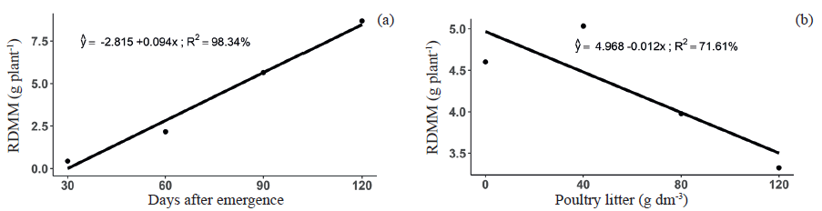 The mass accumulation of the root dry matter, as a function of the poultry litter doses (Figure 4b), presented a different behavior from that obtained for the accumulation as a function of days (Figure 4a). It was observed that the increase of the litter doses promoted a linear decreasing effect, being the greater accumulation obtained at the dose of 1 g dm-3. The increase of litter doses decreased the dry matter mass of roots by 70.7 %.