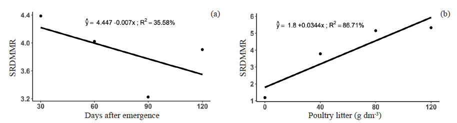 The shoot/root dry matter mass ratio values, as a function of litter doses, increased linearly with increasing doses, with values of 2.3 and 6.0 in the lowest and highest doses applied (Figure 5b), respectively, with a maximum increase with the maximum dose of 120 g dm-3. This effect indicates that the supply of nutrients through the litter doses applied provided a greater root development and, consequently, a greater availability for the growth and mass accumulation of the shoot dry matter mass, as emphasized by Souza et al. (2017) in the production of Salvia officinalis L. under poultry litter doses.