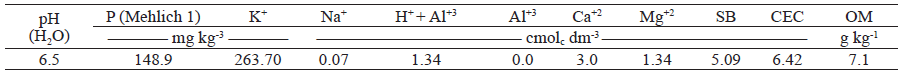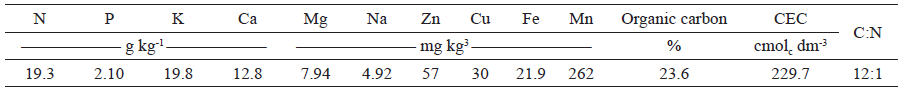 The poultry litter passed through a 1 mm sieve. For the litter with a diameter between 3 mm and 4 mm, the sieving was done in a 4 mm mesh; the material was sieved again, this time in a 3 mm mesh sieve, so that any substrate that did not have a 4 mm granulometry was removed, leaving only the material with the granulometry of interest (4 mm). The chemical attributes of the poultry litter are presented in Table 3.