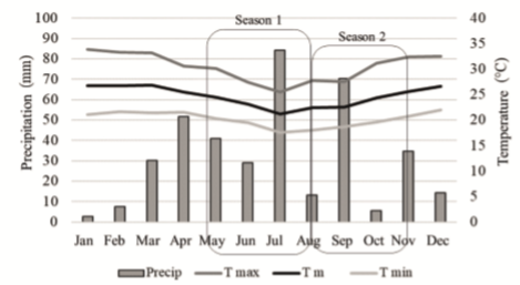 A complete randomized block design was used, with three replications, each plot with 20 plants, in a 2 x 2 x 5 factorial scheme, in which two varieties of Physalis ixocarpa, the ‘purple’ and the ‘green’ ones, were evaluated during two growing seasons: season 1 (May to August 2017), when there is a higher total rainfall and milder temperatures; and season 2 (August to November 2017), in which rainfall decreases and temperature increases (Figure 1), and five stages of fruit maturation.