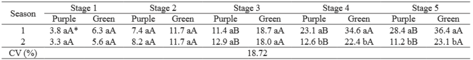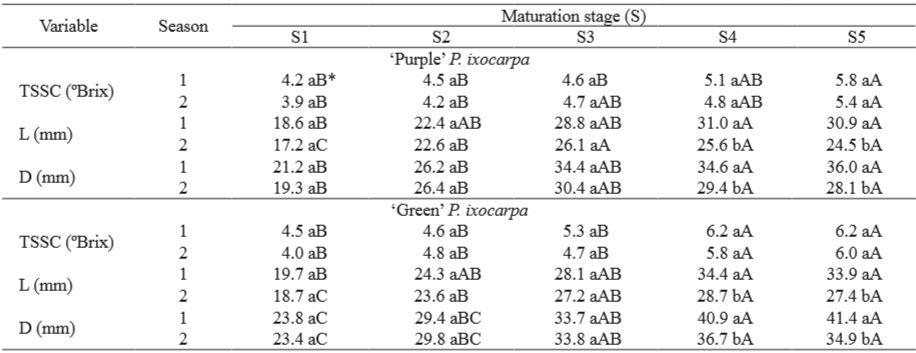 Regarding the variables length, diameter and total soluble solids contents, the effect of the interaction season x variety x maturation stages was not significant. However, when the growing season and maturation stage were tested separately, there was a significant difference for the ‘purple’ and ‘green’ varieties (Table 2).