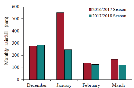 The regional climate, according to the Köppen classification, is Aw, characterized as tropical, with hot summers and a tendency toward high rainfall levels, and dry winters, with a dry season between May and September. The mean annual temperature is 24.1 ºC, with a minimum of 16.4 ºC (July) and a maximum of 28.6 ºC (January), with a mean annual rainfall of 1,520 mm. The rainfall data gathered during the experiments are shown in Figure 1. The total rainfall, during the 2016/2017 growing season, was 1,032 mm, while, in the 2017/2018 growing season, it was 676 mm.