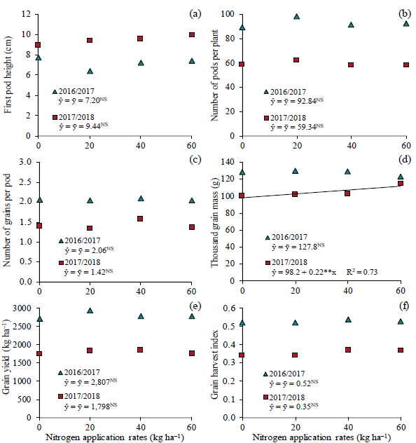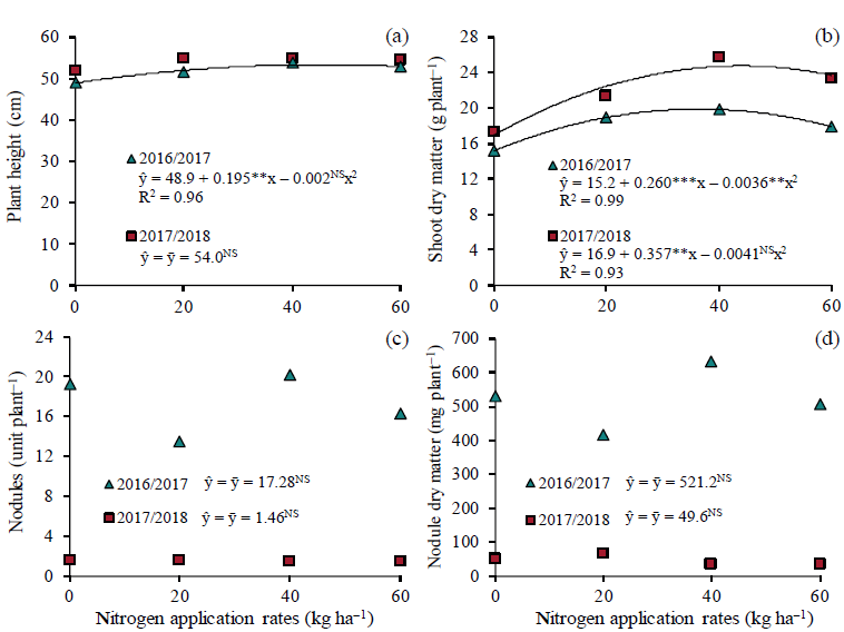 seasons were not significantly affected (p > 0.05) by the N fertilizer rates (Figures 2c and 2d). The highest plant height in the 2016/2017 season (53.7 cm) was obtained with the application of 49 kg ha-1 of N, whereas, in the 2017/2018 season, the plant height remained constant in all the N levels assessed (Figure 2a). In the 2016/2017 growing season, the highest accumulation for shoot dry matter (19.9 g plant-1) was obtained with the application of 36 kg ha-1 of N, whereas the highest accumulation for shoot dry matter (24.7 g plant-1) in the 2017/2018 season was obtained with the application of 44 kg ha-1 of N (Figure 2b). In general, these results show that the optimal N application rate for soybean shoot growth may range between 35 kg ha-1 and 50 kg ha-1 of N. Similarly, Parente et al. (2015) also found a positive response to N fertilizer applications up to 40 kg ha-1 of N in the shoot growth of soybean plants. These results are due to N being one of the most important nutrients to increase the growth and dry matter production of plants, because it is a constituent of amino acids, proteins, enzymes and the chlorophyll molecule, with a marked effect on the increase of the photosynthetic rate (Taiz et al. 2017). However, this improvement in the shoot growth of soybean plants did not increase the production components and grain yield of the crop (Figure 3).