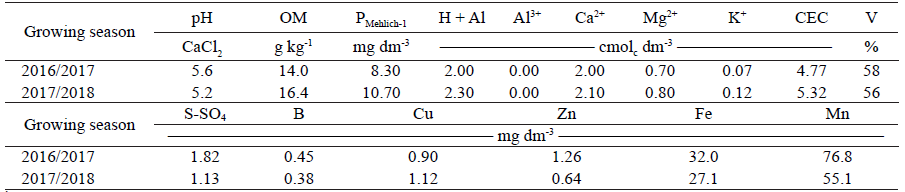 The soybean seeds were sown manually on December 15, 2016 (2016/2017 growing season) and December 08, 2017 (2017/2018 growing season), in rows of 0.50 m apart, at a density of