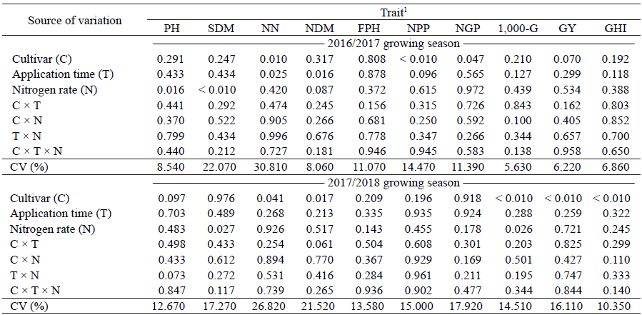 1 PH: plant height; SDM: shoot dry matter; NN: number of nodules per plant; NDM: nodule dry matter; FPH: first pod height; NPP: number of pods per plant; NGP: number of grains per pod; 1,000-G: 1,000-grain mass; GY: grain yield; GHI: grain harvest index; CV: coefficient of variation.
