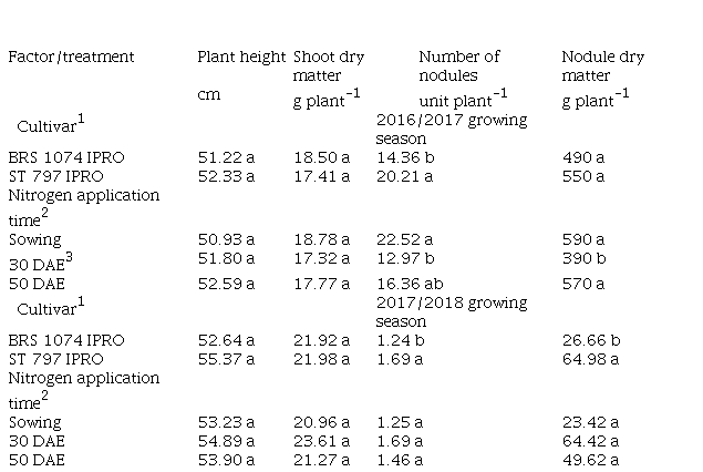 The plant height and shoot dry matter were similar between the two soybean cultivars, in both growing seasons (Table 3). These results may be due to the fact that the height and shoot dry matter accumulation of the plants are two agronomic traits controlled mainly by genetic factors of the cultivar, and that the two cultivars used in this study have a similar shoot growth potential. Parente et al. (2015) also reported the similarity of plant height in two other soybean cultivars with high productive potential (BMX Potência RR and BRS Valiosa RR).