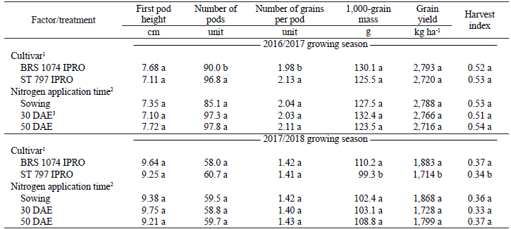In the 2016/2017 growing season, there was a significant difference (p < 0.05) between the soybean cultivars for the number of pods per plant and number of grains per pod, with the highest means for the ST 797 IPRO cultivar (Table 4). In the 2017/2018 season, the highest 1,000-grain mass, grain yield and grain harvest index were obtained for the BRS 1074 IPRO cultivar, whereas other agronomic traits did not show differences between the cultivars (Table 4). Parente et al. (2015), evaluating the effect of N fertilization on two other soybean cultivars, also reported genotypic differences for 1,000-grain mass and grain yield. These soybean cultivar differences for the production components and grain yield may be related to the genetic potential and other intrinsic characteristics of each cultivar (Felisberto et al. 2015, Soares et al. 2015).