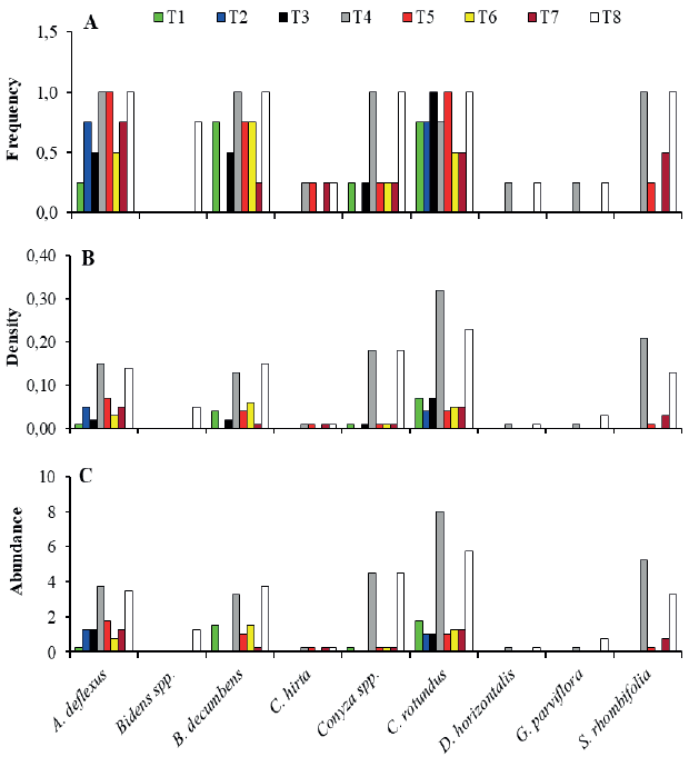 C. rotundus exhibited the highest frequency, density and abundance in the weed community, primarily in treatments without mulching (T4 and T8), followed by Conyza spp., S. rhombifolia,