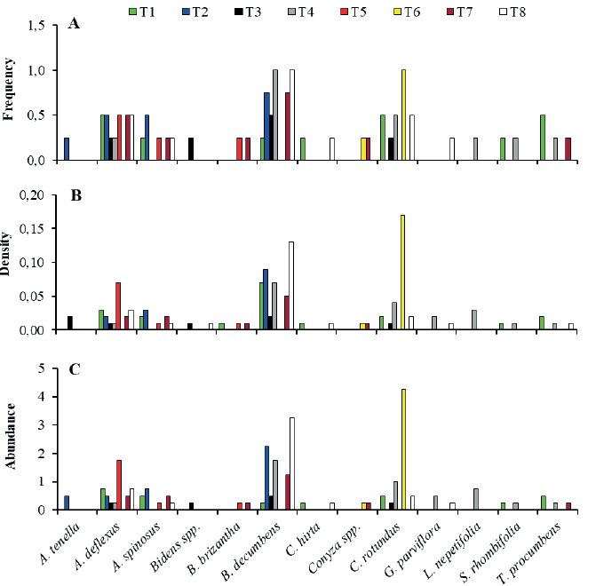 Weed density increased in the treatment with non-solarized soil without mulching (T8) and with rattlepod (T6) for B. decumbens and C. rotundus, respectively (Figure 2B). A similar behavior occurred with abundance for these species in treatments T6