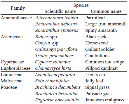 The families with the highest population densities were Cyperaceae with 113 individuals, Poaceae with 86 and Amaranthaceae with 82. Those with the greatest species diversity were Asteraceae with 4 species, followed by Poaceae with 3, and the species with the highest density were Cyperus rotundus, Brachiaria decumbens and Amaranthus deflexus.